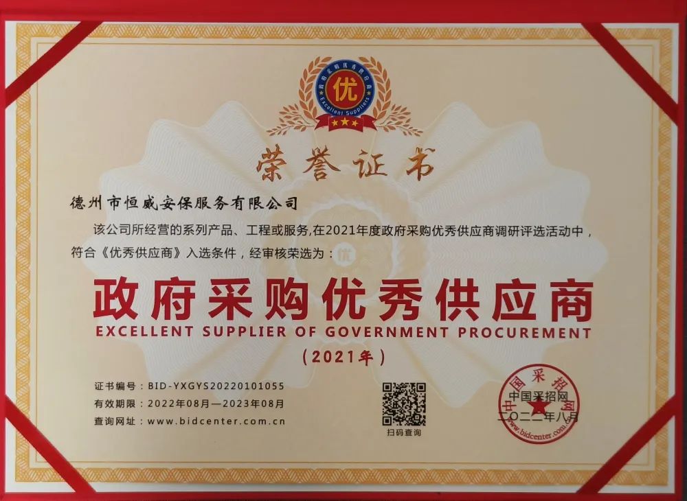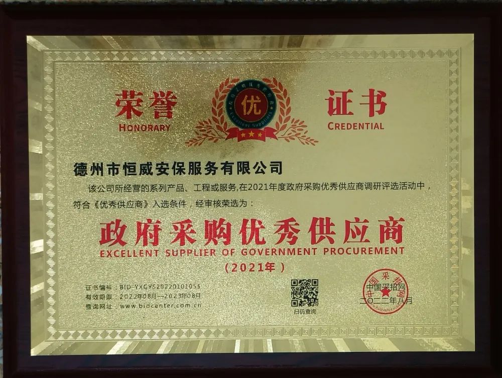熱烈祝賀!德州市恒威安保服務(wù)有限公司榮獲“,采購(gòu)優(yōu)良供應(yīng)商”榮譽(yù)稱(chēng)號(hào)