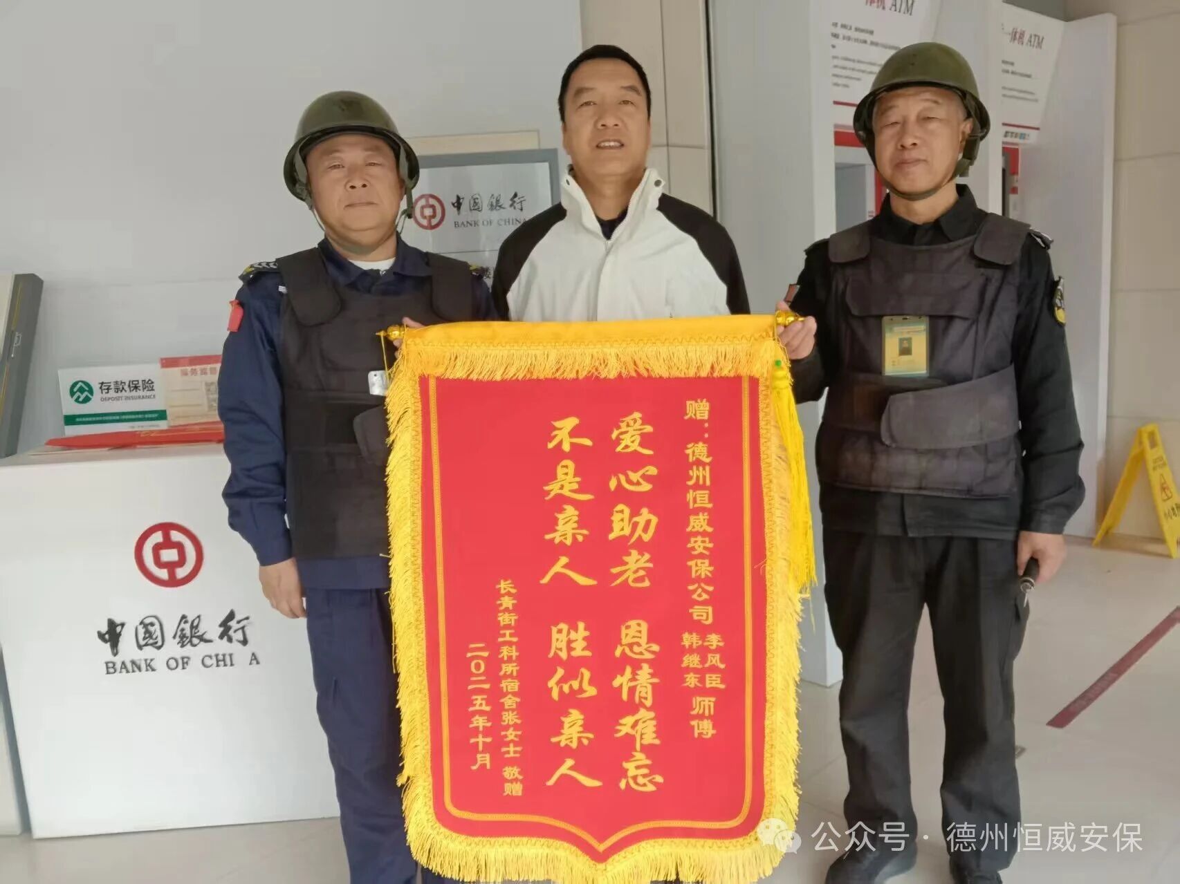 近日,家住長青街工科所宿舍的張女士專程來到中國銀行新湖支行網點,將一面印有“愛心助老,恩情難忘,不是親人,勝似親人”的錦旗交到駐點保安員李風臣和韓繼東手中,以此感謝他們對家中八旬母親的及時救助與溫情守護。
