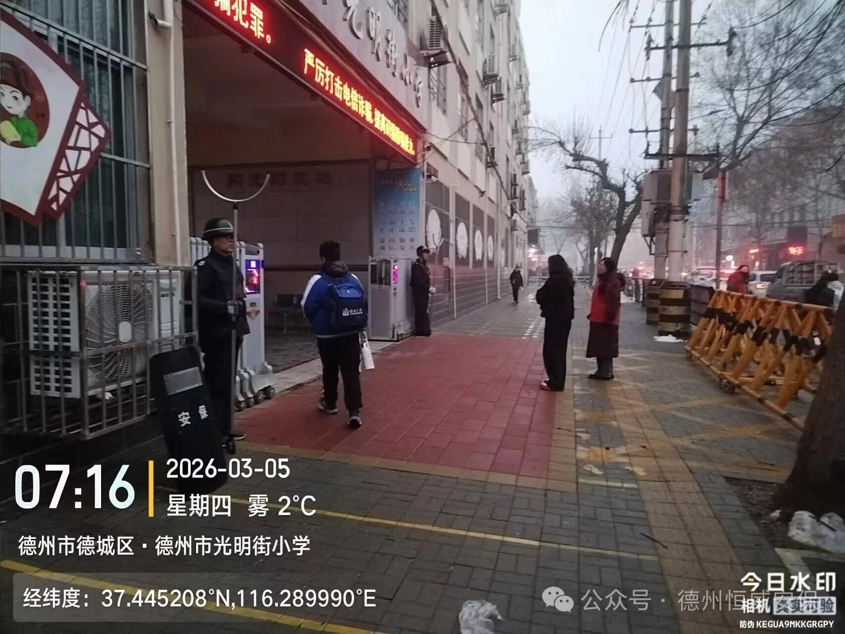 開學當天,全體校園保安隊員提前半小時到達各自工作崗位。到崗后,第一時間與學校值班領導完成工作對接,迅速熟悉當日工作流程與重點。嚴格按照既定安保工作預案,熱情、規范開展工作:積極協助交警和校方引導接送學生車輛有序停靠、即停即走,疏導校門口及周邊交通秩序;耐心引導學生有序排隊,安全、有序進入校園;密切關注周邊動態,加強巡邏防控,全力確保開學首日校園及周邊秩序井然,讓家長放心,讓師生安心。